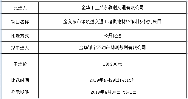 金華市金義東軌道交通有限公司運營2026-2027年度活動實施服務(wù)機構(gòu)框架協(xié)議項目中標候選人公示