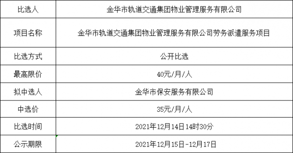 金華市軌道交通集團(tuán)物業(yè)管理服務(wù)有限公司勞務(wù)派遣服務(wù)項(xiàng)目的中選公示