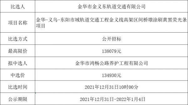 金華-義烏-東陽(yáng)市域軌道交通工程金義線高架區(qū)間橋墩涂刷黃黑熒光條項(xiàng)目中標(biāo)公示